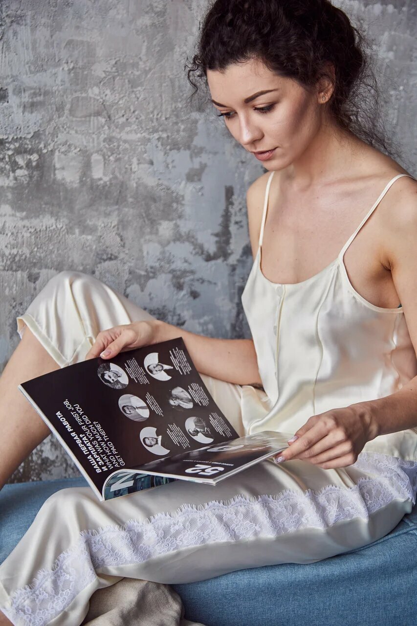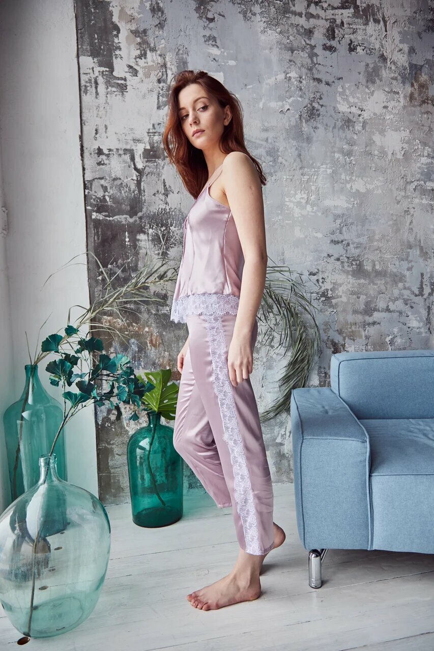 Изящная пижама из гладкого атласа с кружевной отделкой