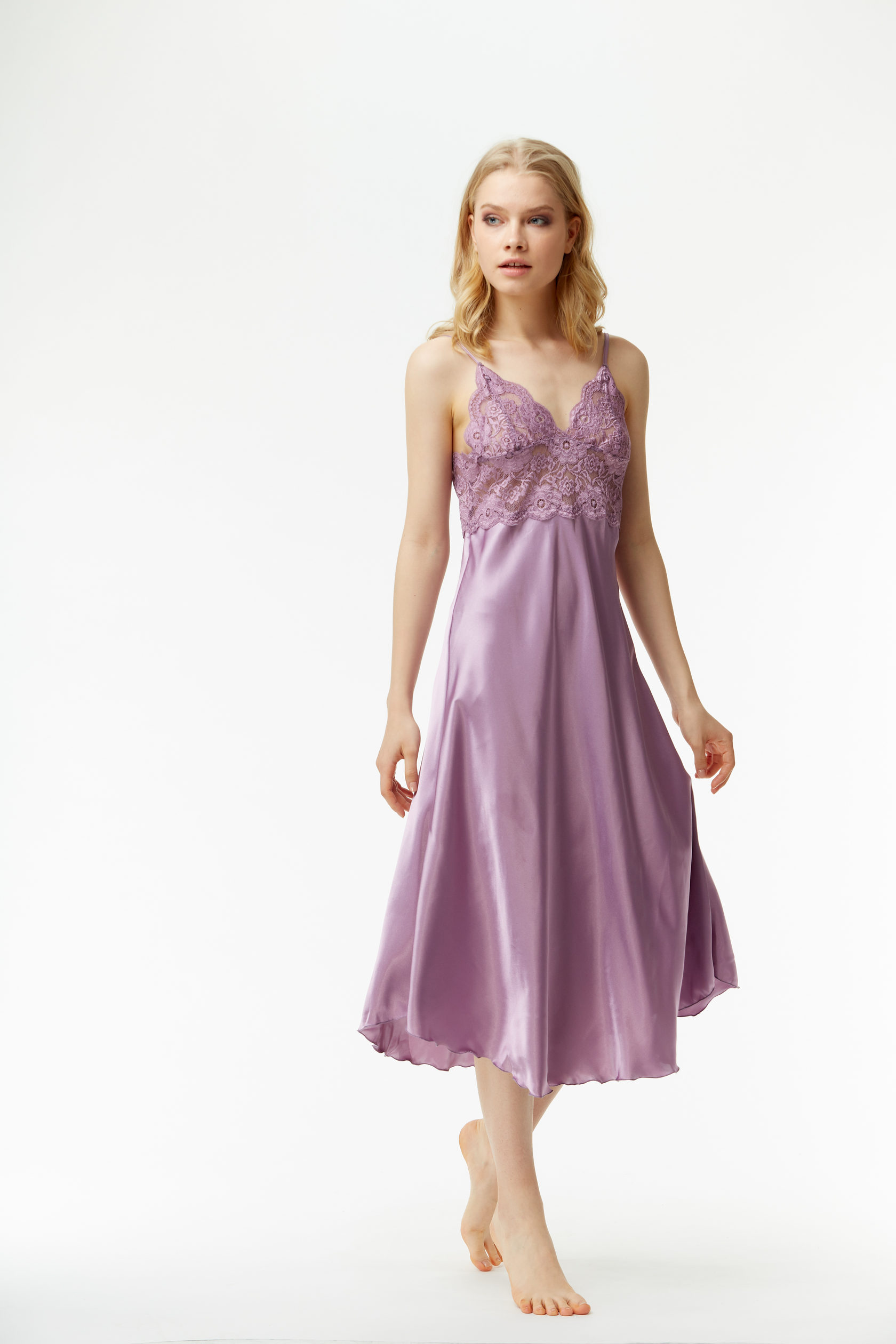 Удлиненная сорочка из атласа или гладкого трикотажа с лифом из широкого кружева.